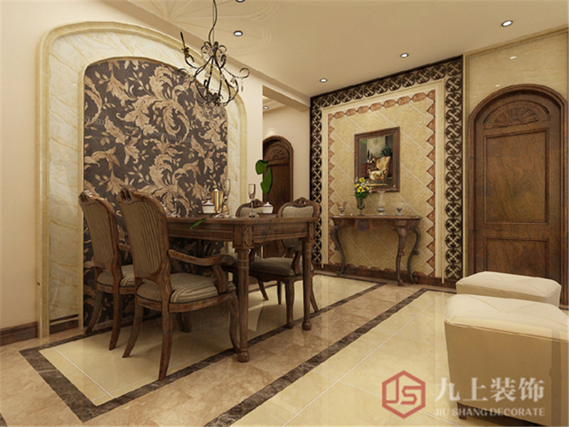 美式的花式線條對應餐廳背景墻的花紋,并加入植物點綴,表現(xiàn)出自然,圓潤的貴族氣息。