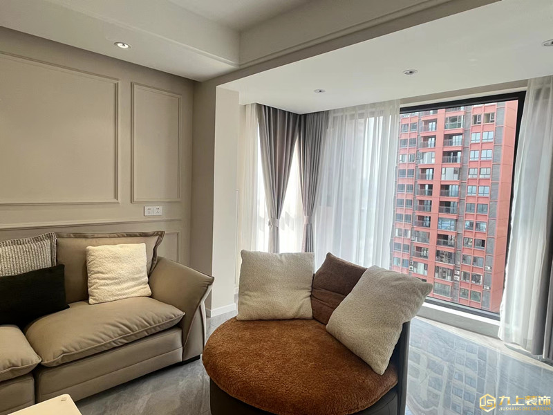 客廳,陽(yáng)臺(tái)納入客廳區(qū)域,擴(kuò)大使用面積與采光,雙眼皮頂面設(shè)計(jì)顯得簡(jiǎn)潔大氣,簡(jiǎn)單的石膏線條沙發(fā)背景墻造型,搭配科技布的淺咖色沙發(fā)。