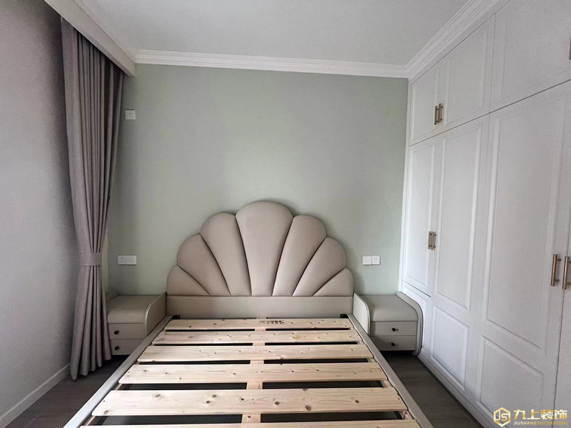 主臥,淡綠色的背景墻色調(diào),營(yíng)造出溫馨感,延續(xù)公共區(qū)域的氛圍,弧形分色處理的吊頂弱化飄窗頂?shù)耐瑫r(shí)增加空間層次感