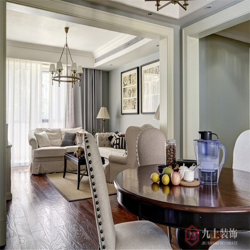 體現(xiàn)田園的清新淡雅,采用壁紙、仿古磚、布藝沙發(fā)、實(shí)木復(fù)合地板等,營(yíng)造出一種田園氛圍