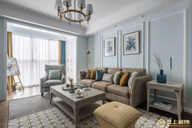 客廳以淡藍色與白色為基調(diào),視線所及明亮而溫和,營造清新浪漫的舒適感受。