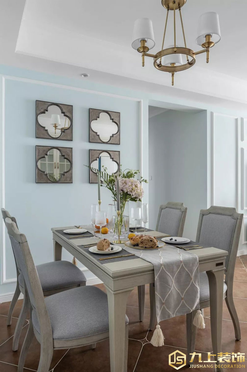 餐廳與客廳風格保持連續(xù)性,餐廳選用客廳同色系家具,利用走廊動線分隔兩塊功能空間。