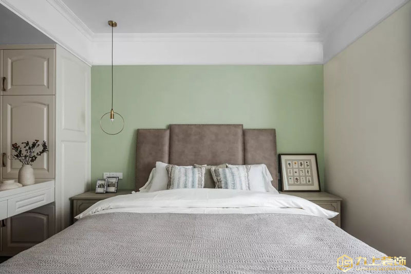 主臥以低飽和度的草綠色為主調(diào),搭配內(nèi)斂的灰色調(diào)床品,營造柔和、寧靜的睡眠空間。