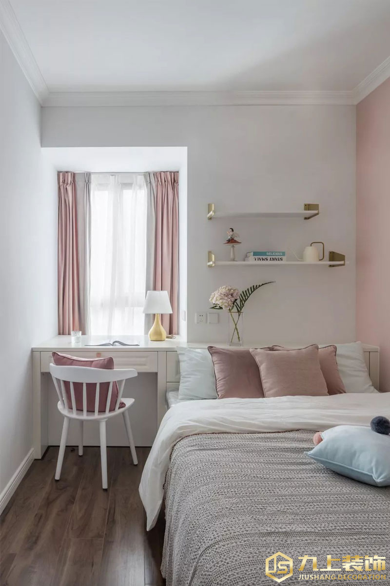 將飄窗位置改造成書桌,方便孩子讀書學習。紗簾的使用讓整個空間的光感更加柔和,保留空間光線的同時又不刺眼。