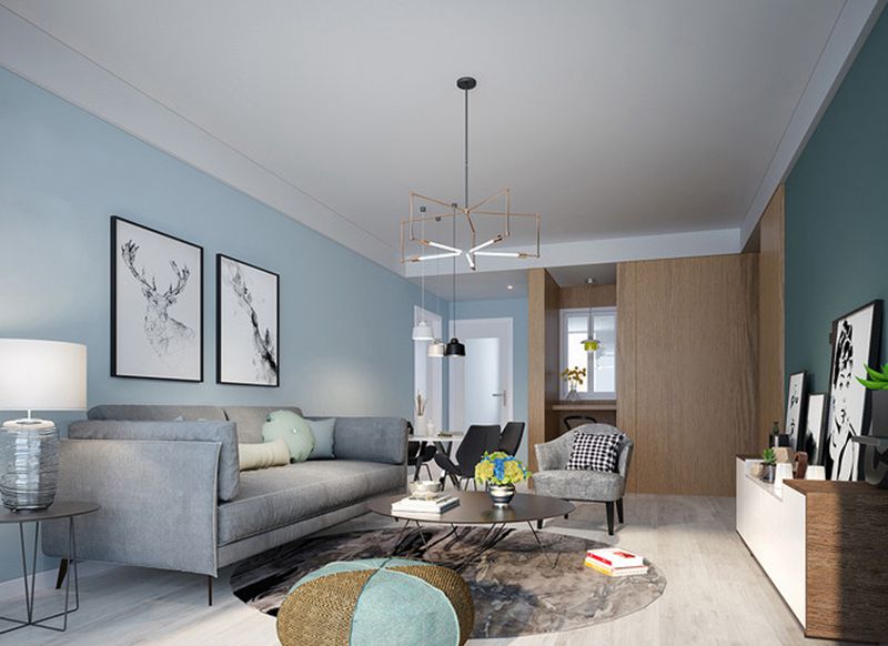 客廳以流暢的設(shè)計來展現(xiàn)簡約設(shè)計的魔幻,淺藍色墻面和白色吊頂以柔和的色彩,營造了一個海天的場景,十分清靈;而素色簡畫和灰色布藝沙發(fā)的灰雅,在輕薄的鐵藝茶幾和圓毯的點綴中,簡約和美。