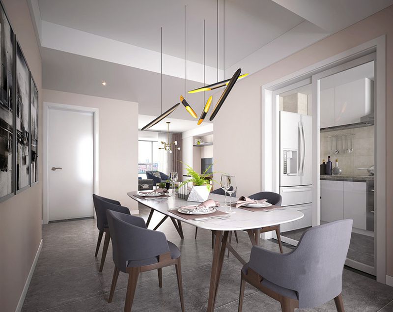 餐廳以駝色的墻面漆來雕琢出中性色調(diào)的溫沉,與灰色仿古磚的冷調(diào)構(gòu)成應(yīng)和,而白色橢圓形餐桌在紫色木質(zhì)餐椅的陪襯中,展現(xiàn)在著現(xiàn)代簡約設(shè)計的個性和實用,令整個空間愈顯唯美典雅。