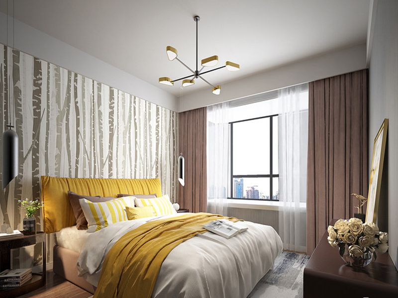 臥室以深林圖案的壁紙來彰顯自然之調(diào),個性的金屬臺燈和黃銅吊燈無疑是整個空間的亮點;在簡約與時尚之中,設(shè)計師以白色與黃色相結(jié)合的床品來表現(xiàn)溫馨明快;灰色調(diào)的地毯與磚色窗簾愈添溫馨。