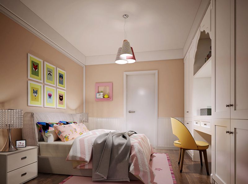 兒童房以裸粉色的墻面漆來奠定整個空間甜美的氛圍,綠色動物掛畫的俏皮和粉色收納架的實用,都裹挾著童心童趣,生機無限;白色收納柜旁明黃色單椅的現(xiàn)代質(zhì)感,與粉色系地毯、床品烘托出清甜。