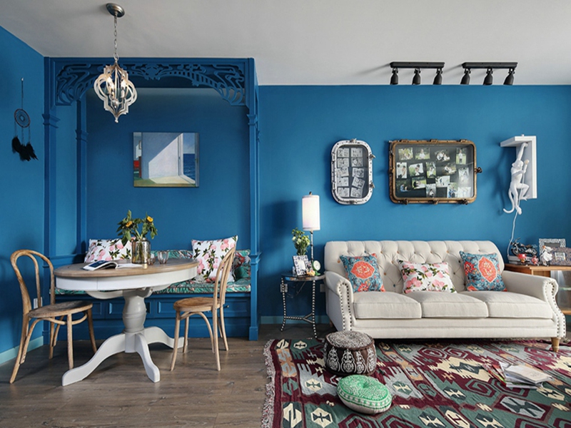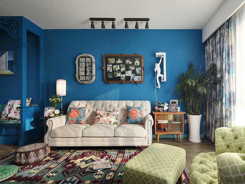 墻面整體用清爽的藍(lán)色為底,豐富、有趣的擺設(shè)讓整個(gè)空間都活潑起來(lái),淺色沙發(fā)印花的地毯都還原出東南亞的自由與快樂(lè)。