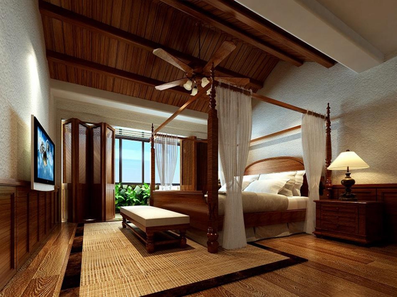 QQ咨詢:東南亞風(fēng)格的特點是原始自然、色澤鮮艷、崇尚手工。在造型上,以對稱的木結(jié)構(gòu)為主,電視一側(cè)種植著芭蕉,營造出濃郁的熱帶風(fēng)情。在色彩上,以溫馨淡雅的中性色彩為主,局部點綴艷麗的紅色,自然溫馨中不失熱情華麗。在材質(zhì)上,運用壁紙、實木、硅藻泥等,演繹原始自然的熱帶風(fēng)情。
