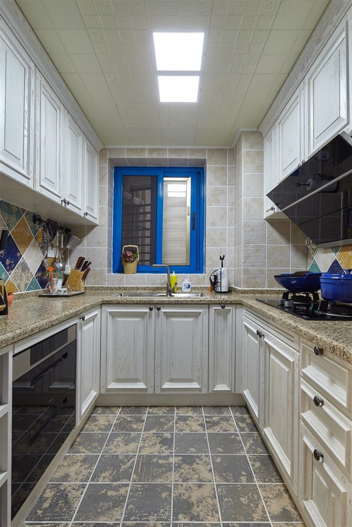 廚房-廚房的墻面和窗框都以藍色為主,木質(zhì)的櫥柜顯得更有質(zhì)感,延續(xù)混搭的和諧