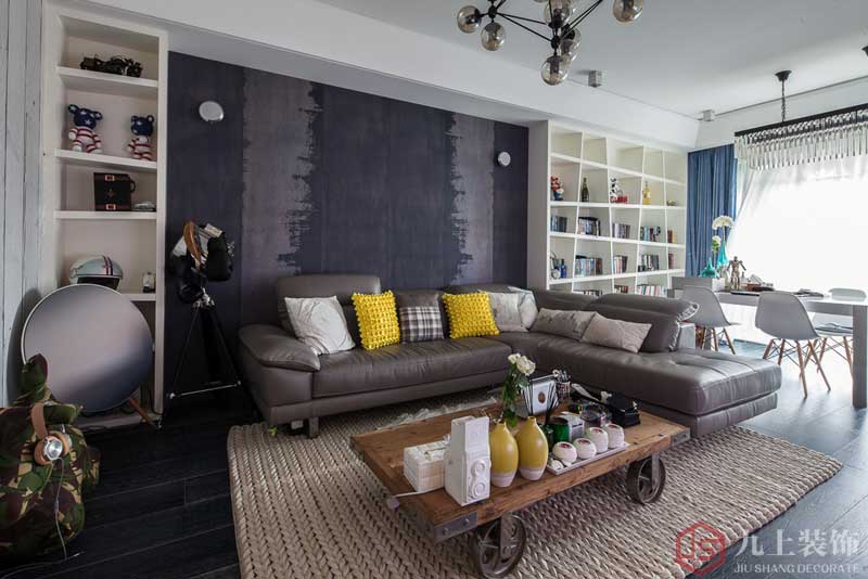 客廳在設(shè)計(jì)上是一個(gè)融合書房功能的整體空間,餐廳(書房)布局在靠近陽(yáng)臺(tái)的區(qū)域,沙發(fā)背墻是一個(gè)被分割的書架露出的墻面滿鋪了墨斑效果的墻布。