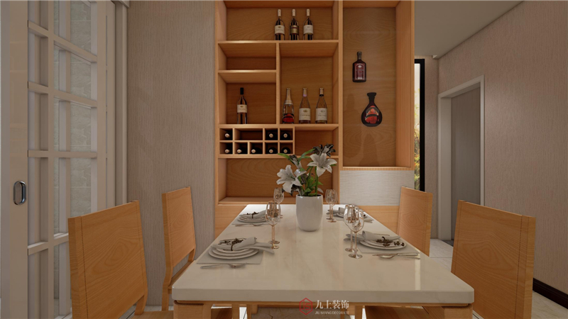 餐廳與客廳之間利用了走道進(jìn)行了劃分,與廚房也利用推拉門進(jìn)行了隔斷,使用起來很是方便。