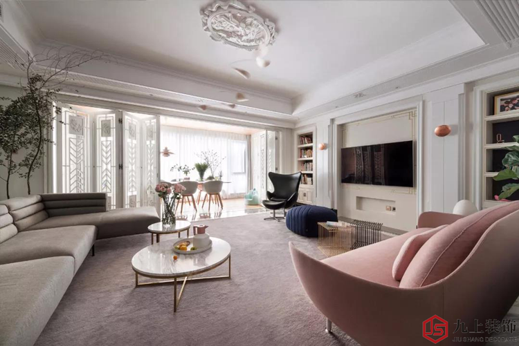 簡(jiǎn)潔時(shí)尚的布置,一進(jìn)門就感受到了輕松舒適的儀式感。整個(gè)客廳以現(xiàn)代優(yōu)雅的空間,搭配上粉色的地毯與家居,還有大理石與黃銅質(zhì)感,布置出一種華麗端莊的檔次感。