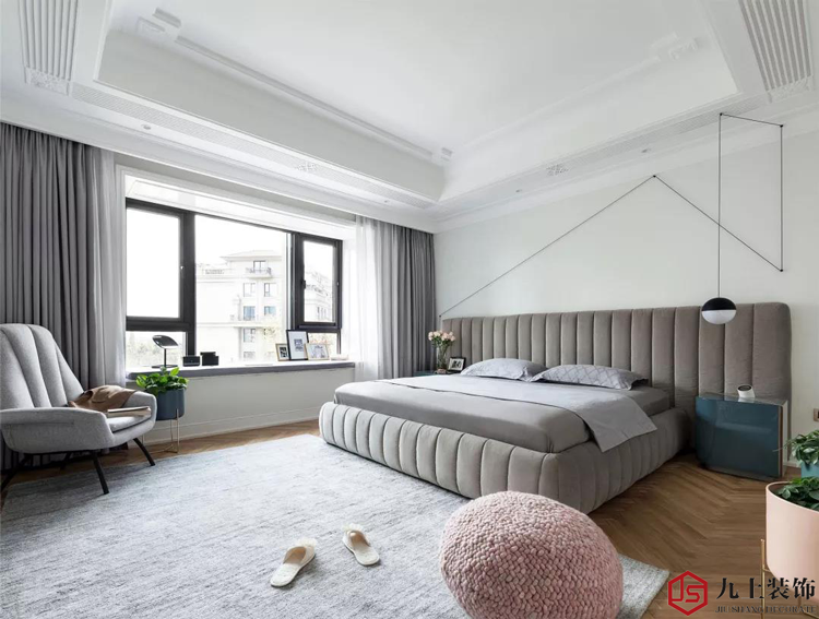 寬敞舒適的主臥空間,床頭背景裝了一整排的軟質(zhì)靠背,而床體也是與靠背一致的暖灰色