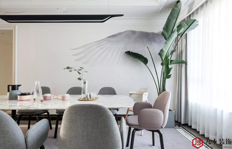 餐廳背景墻大面積的留白從窗戶邊展開一個(gè)墨色飛翅,角落還有一盆芭蕉葉綠植,搭配上輕奢簡(jiǎn)約風(fēng)的餐桌椅布置,帶來(lái)的是一種簡(jiǎn)潔的端莊氣息。